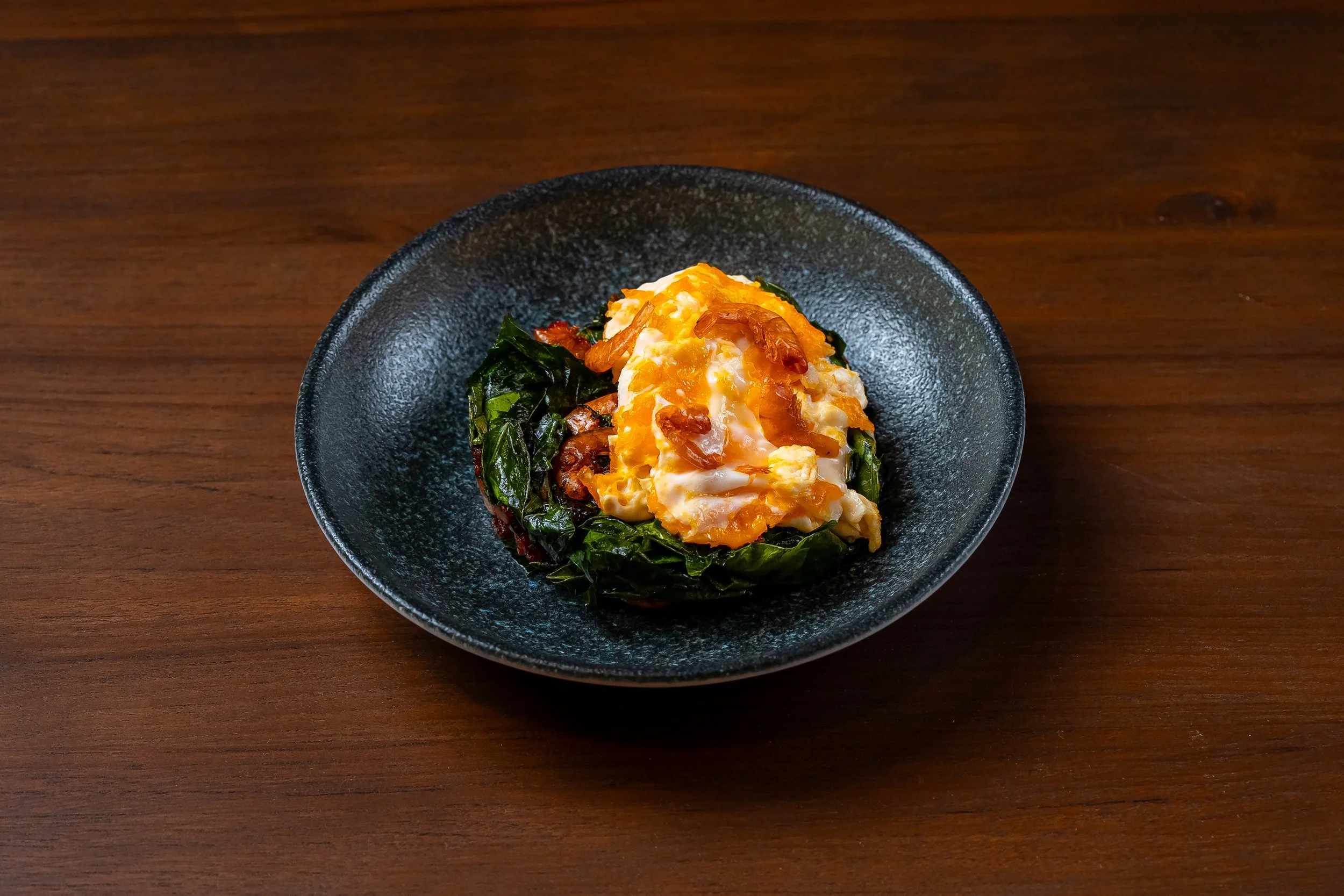 Stie Fried Melinjo Leaves, Cage Free Range Egg, Crispy Smoked Shrimp