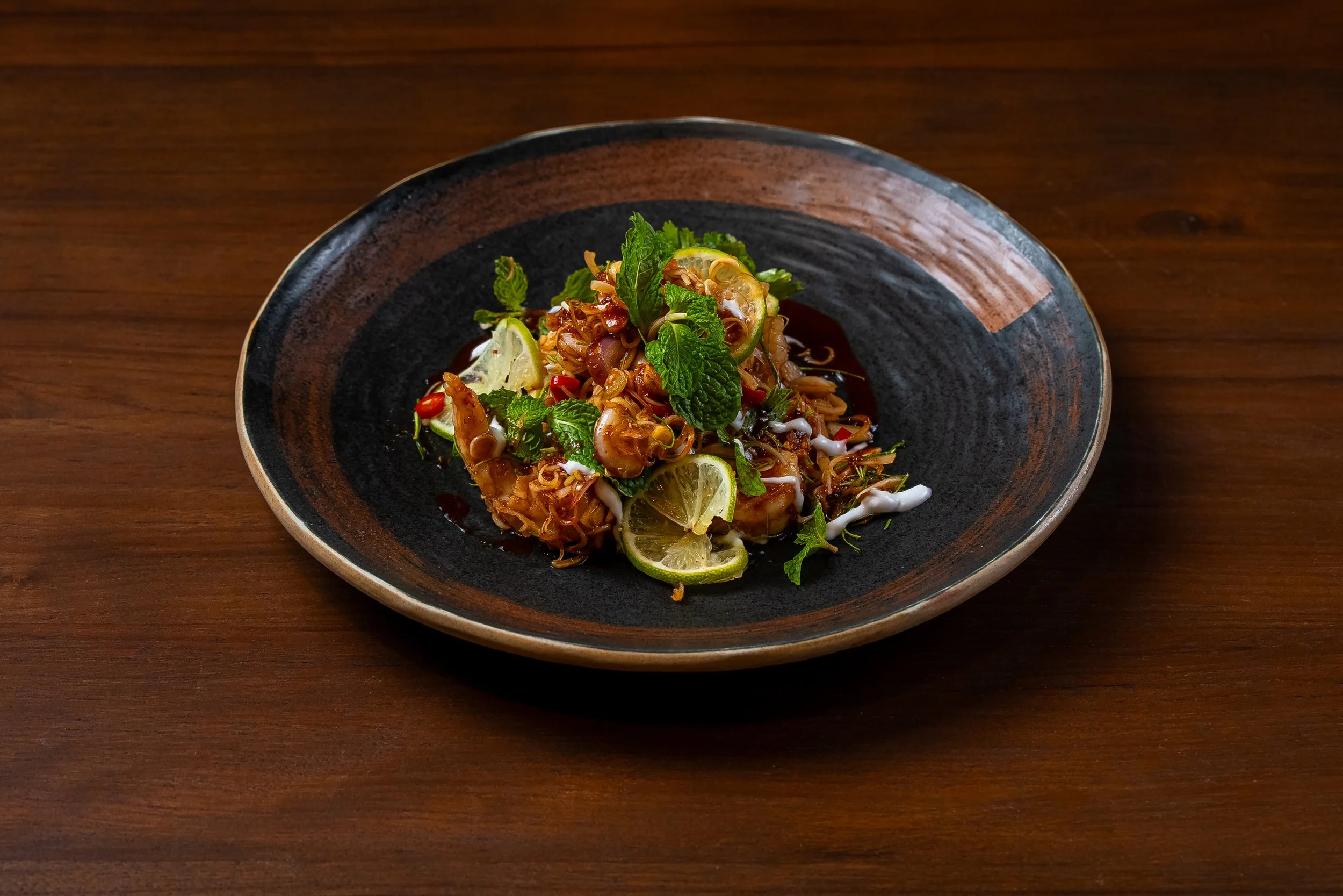 Spicy Local Fern Salad, Prawns, Squid & Coconut Dressing