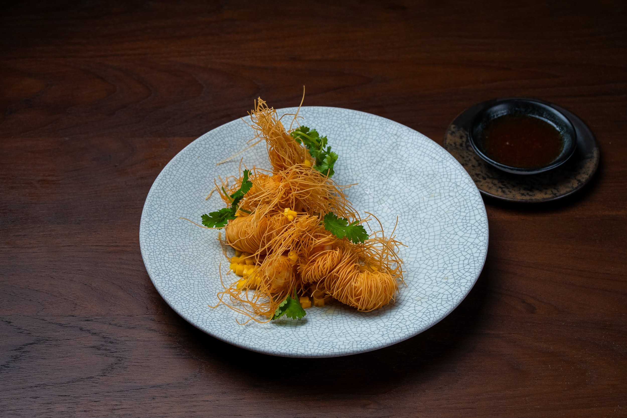 Crispy Rice Noodle Wrapped with Prawn, Sweet Mango Chili Sauce.