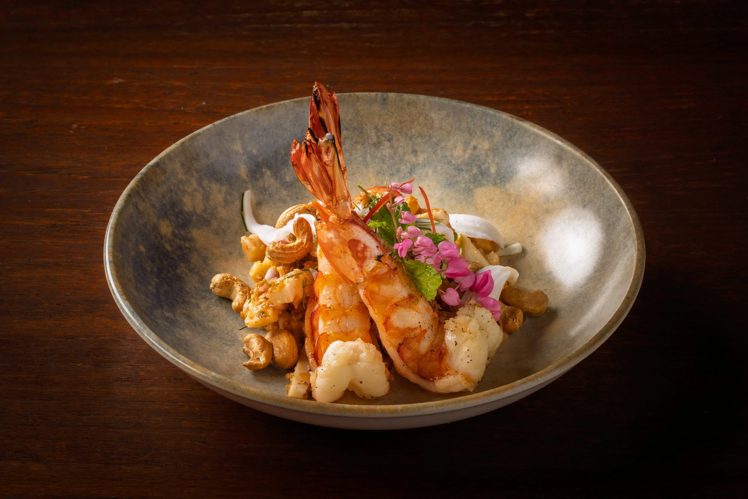 Grilled Tiger Prawn Salad with Chili paste, Thai aromatic herb, Coconut